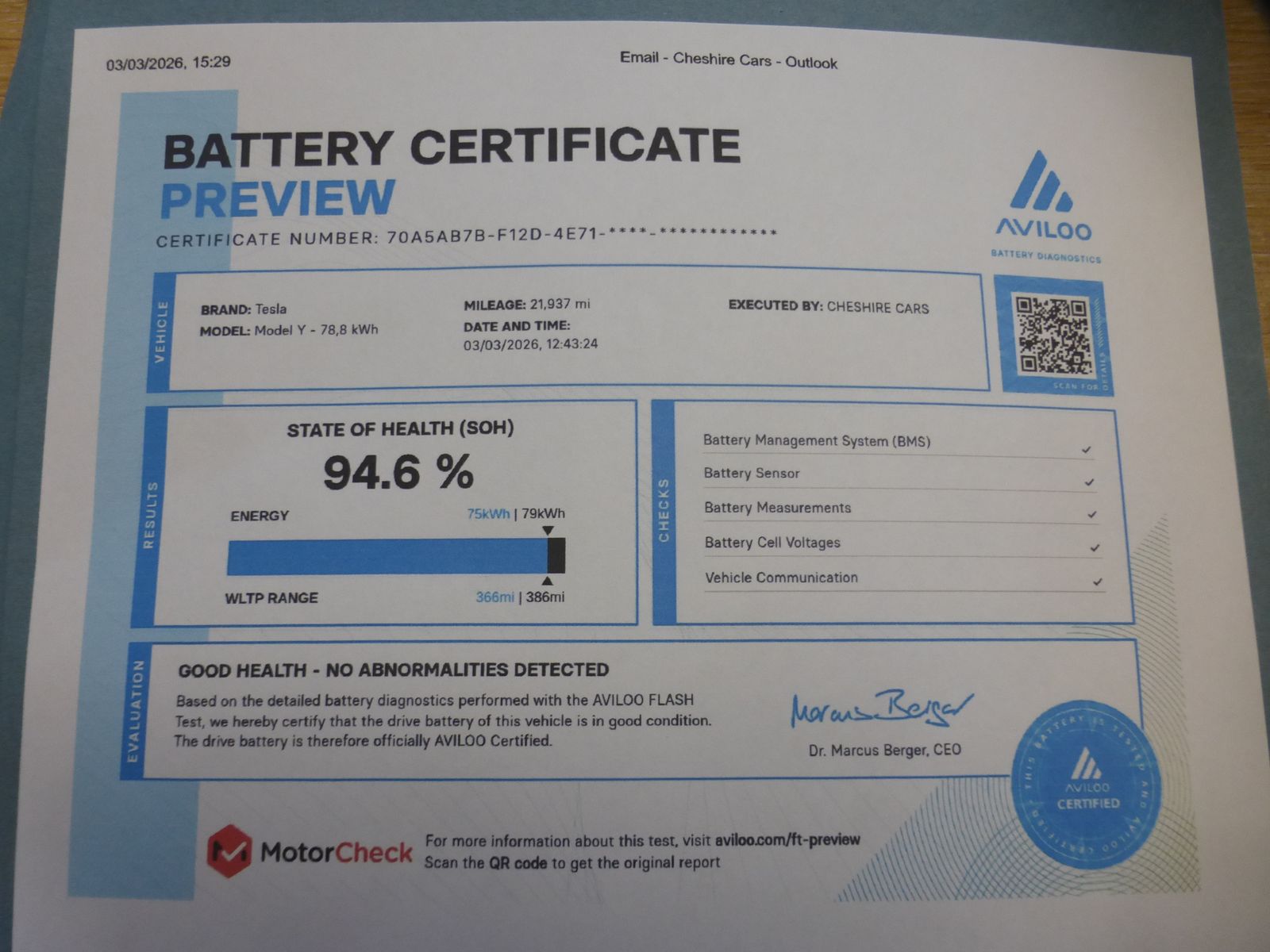 Tesla have a substantial charging network should you require to charge whilst on a journey with the Tesla super chargers for use of Tesla owners exclusively a top up charge can be completed in just 8 minutes or a charge to 80% in just over an hour we inspect all batteries before we agree to purchase so you can be assured that this vehicles battery is in good order with a certificate to back this up therefore even after 4 years of use the expected full range for this exact car is 300 plus miles quite fabulous the certificate is included with the purchase of this Tesla